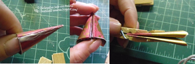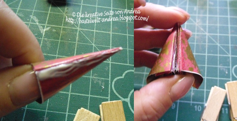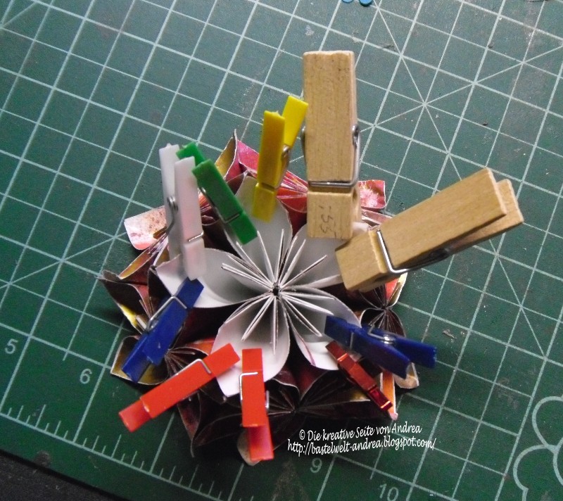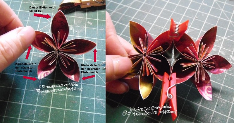 Now we just crush it and I encourage even with small clothespins. So then 5 flower cups are manufactured. These are then glued together. On the 2nd picture you can see, I like the second Calyx at the 1 glue here I encourage it back with clothespins.